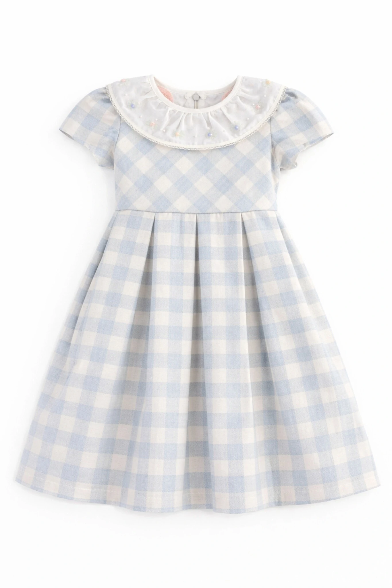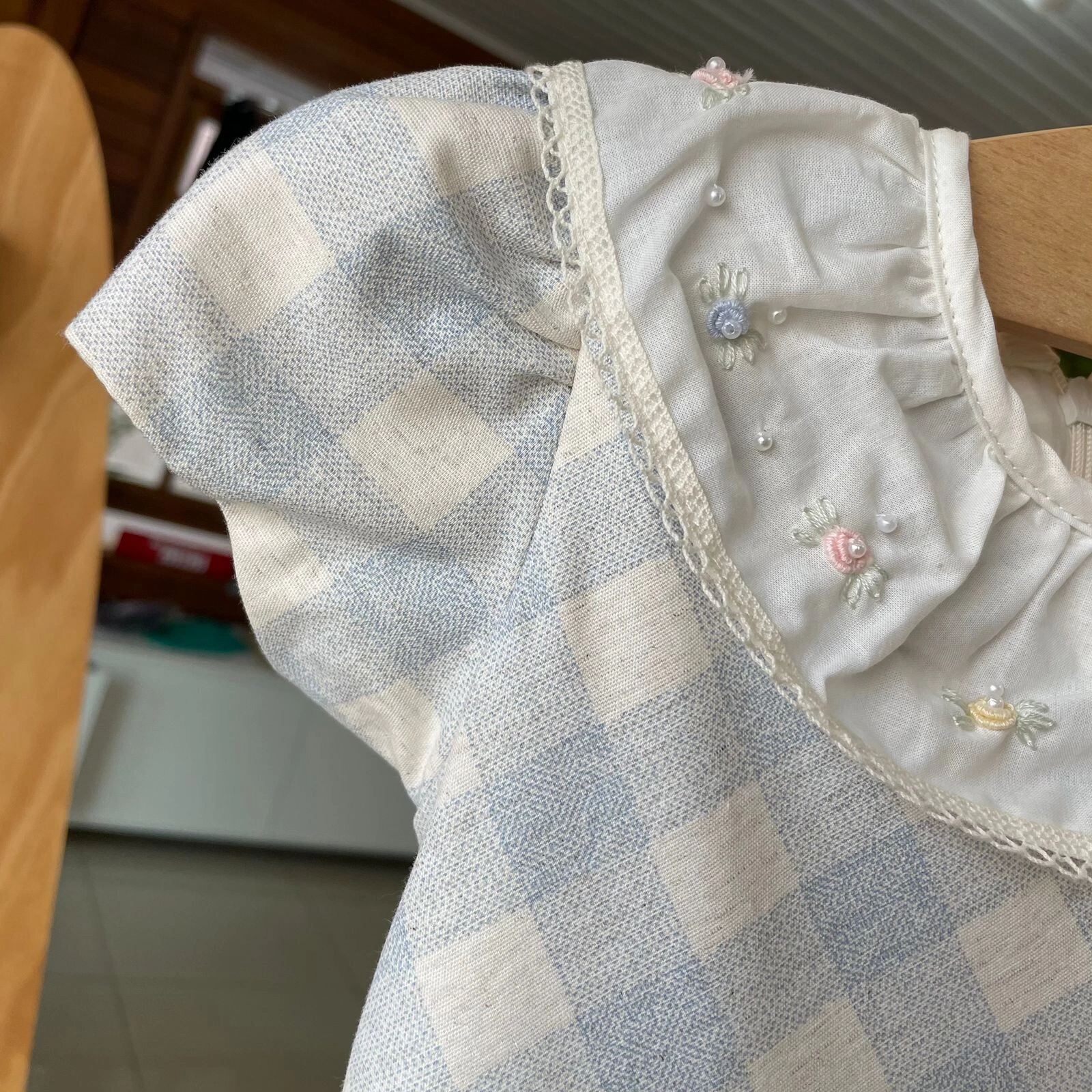 Vestido xadrez azul claro em linho com algodão, com flores bordadas na gola.
