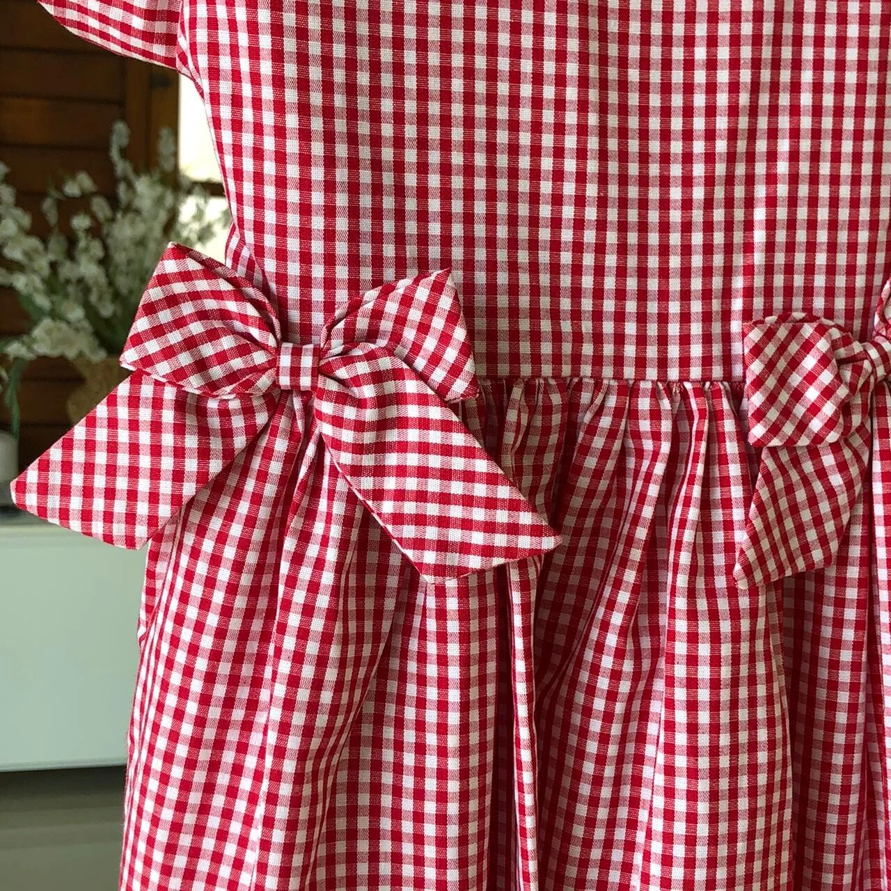 Vestido Xadrez em tricoline 100% algodão. Gola boneca com bordados em flores delicadas e laços na cintura.