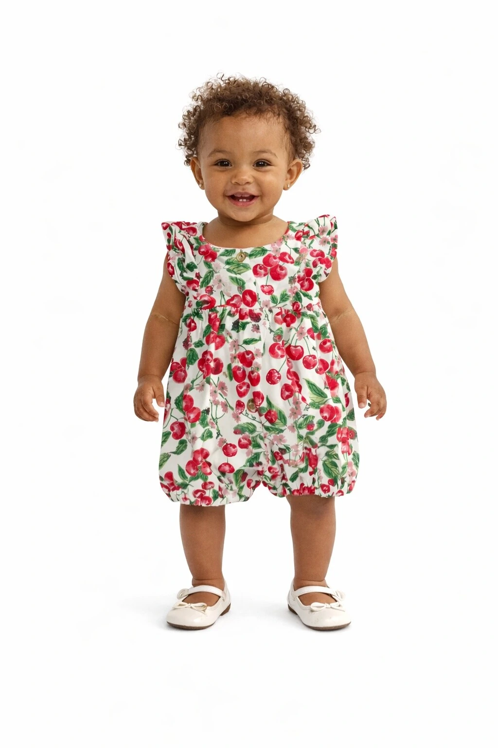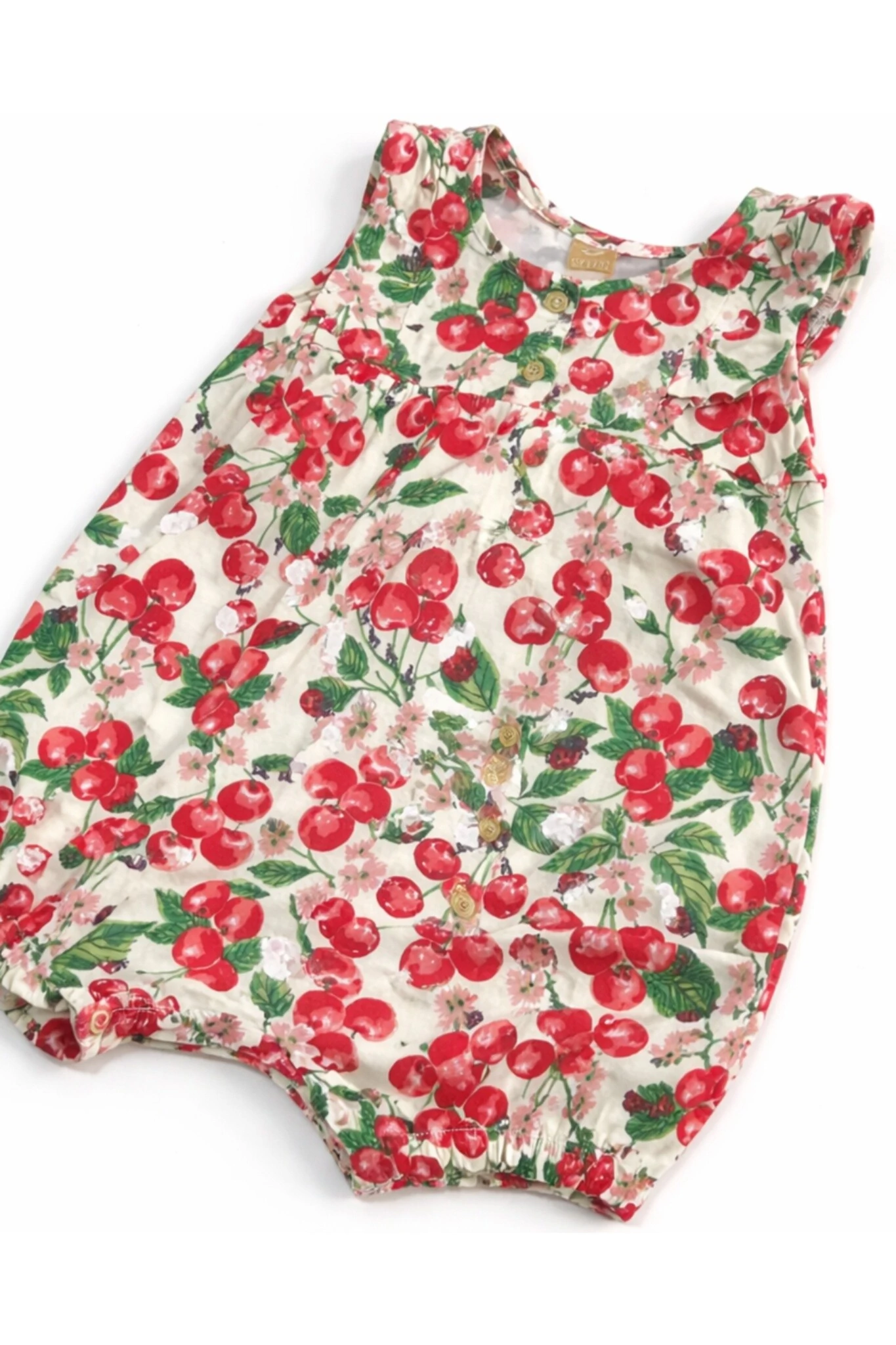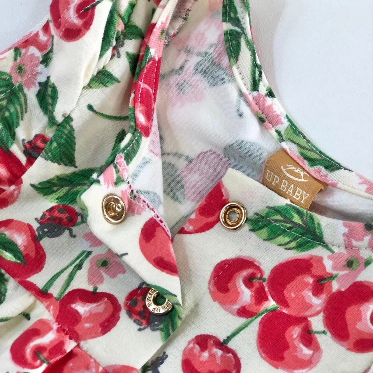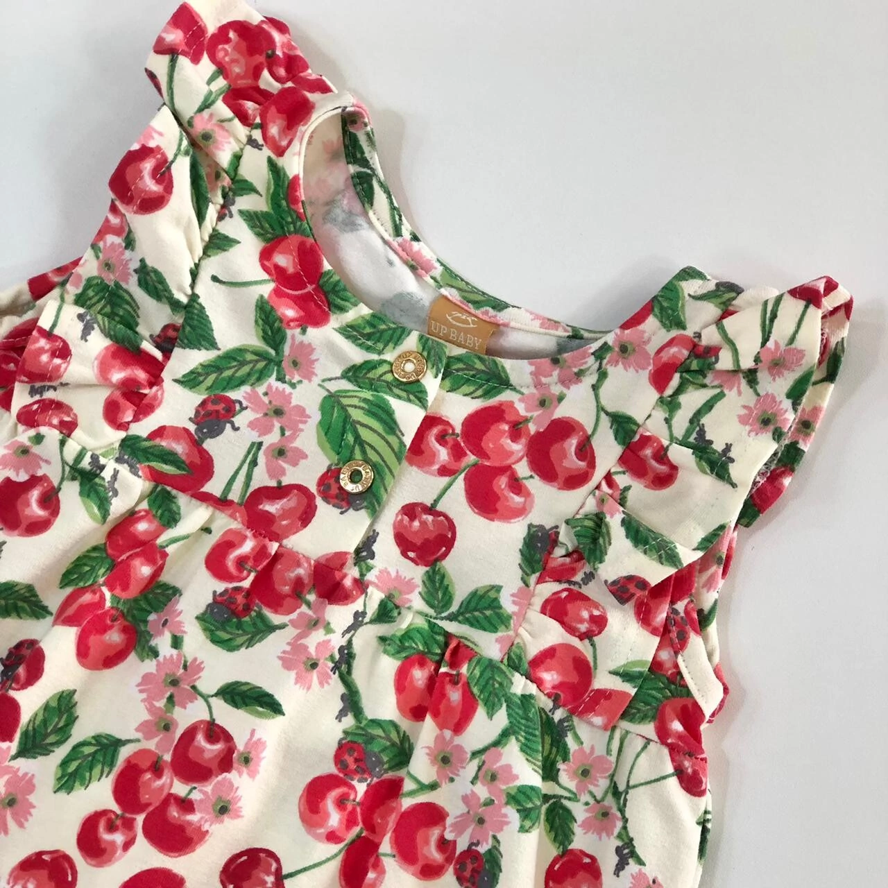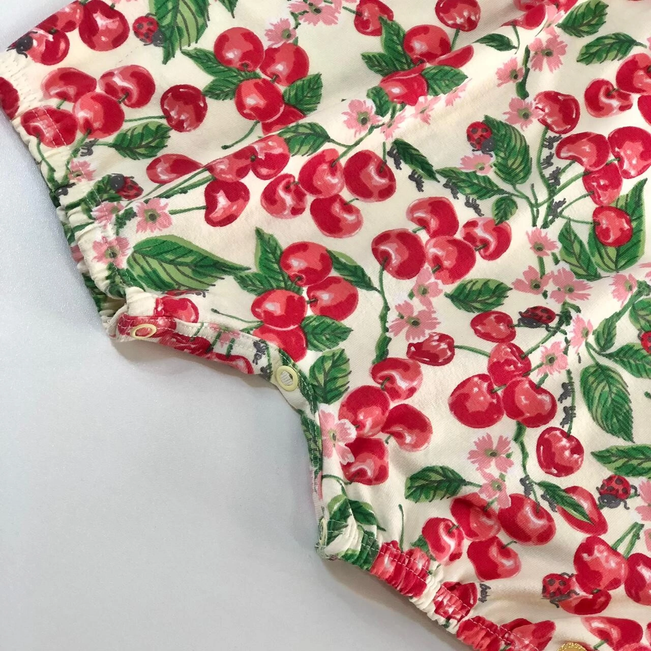 Macacão curto regata em cotton, com elastano na barra e estampa de cereja e joaninha.