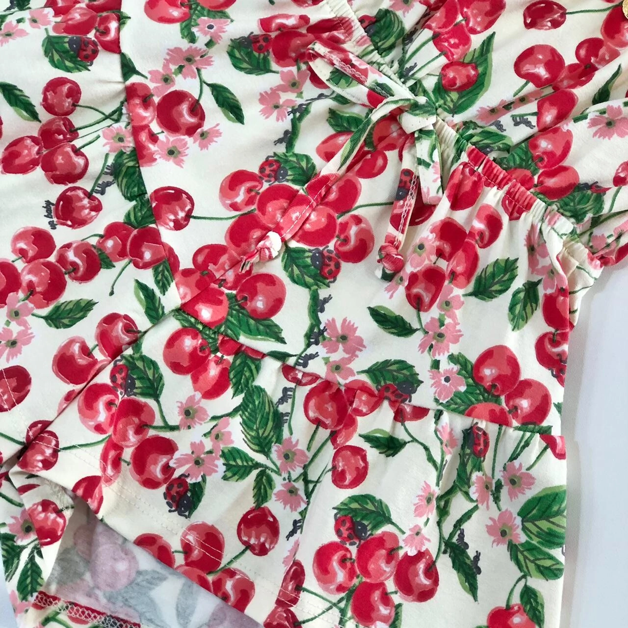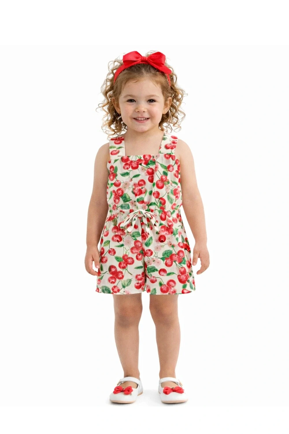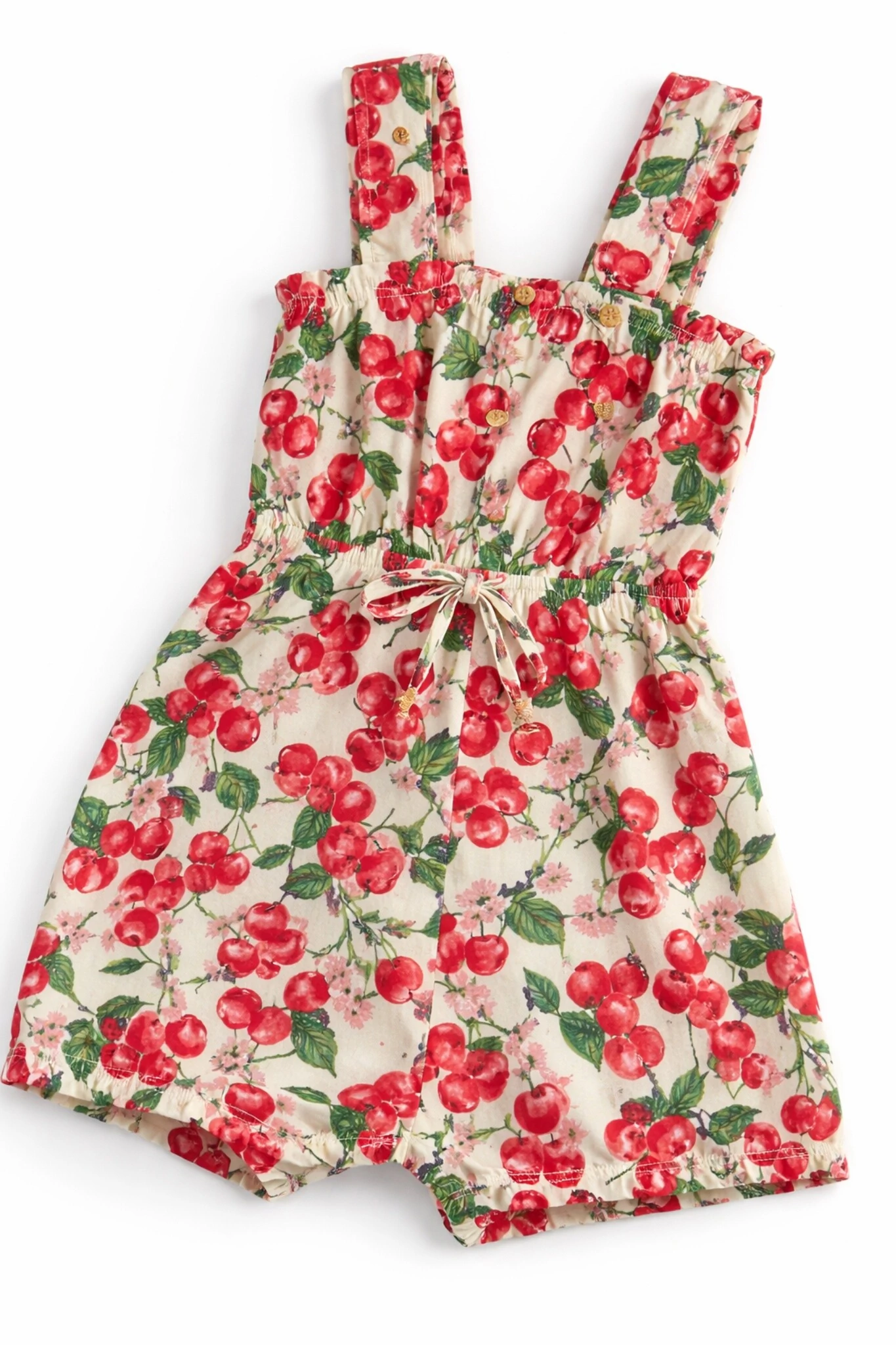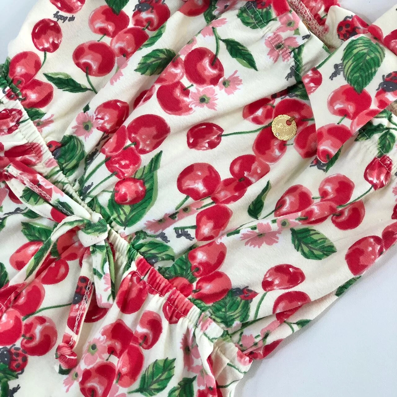 Macacão em cotton, com alça em formato de laço e estampa digital de cereja e joaninha.