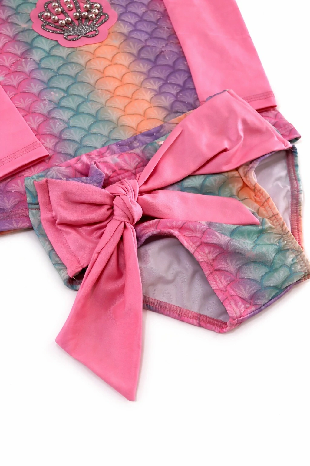 Conjunto de biquíni e blusa manga longa em malha com proteção UV+. Estampa de sereia com pérolas bordadas. SHORT NÃO INCLUSO