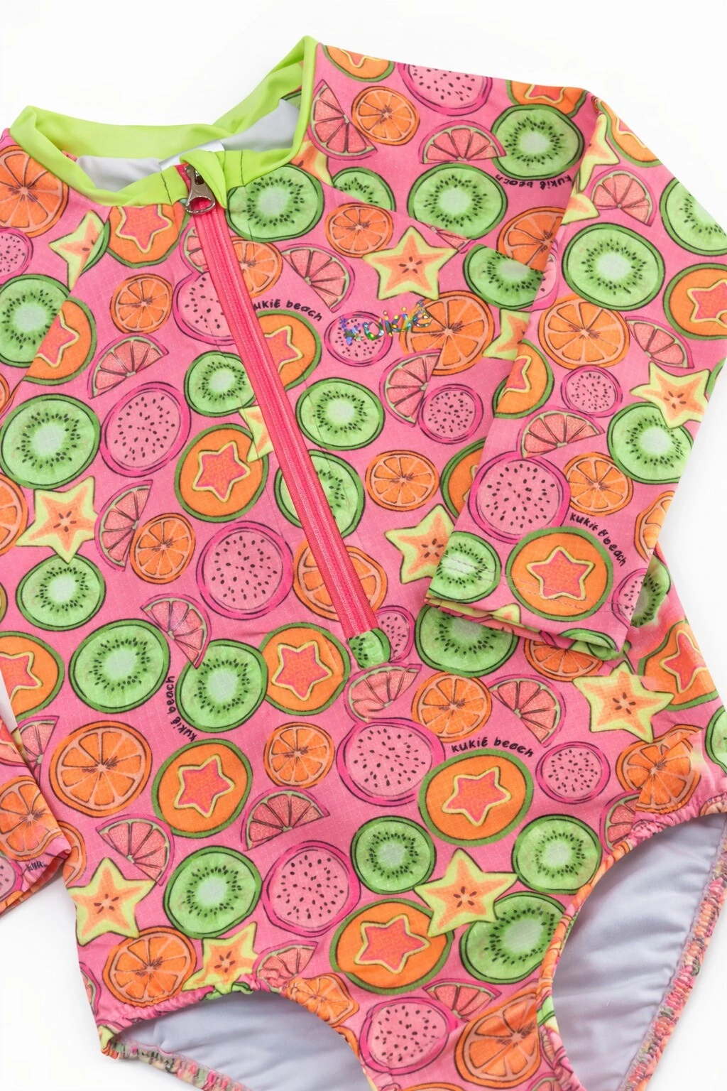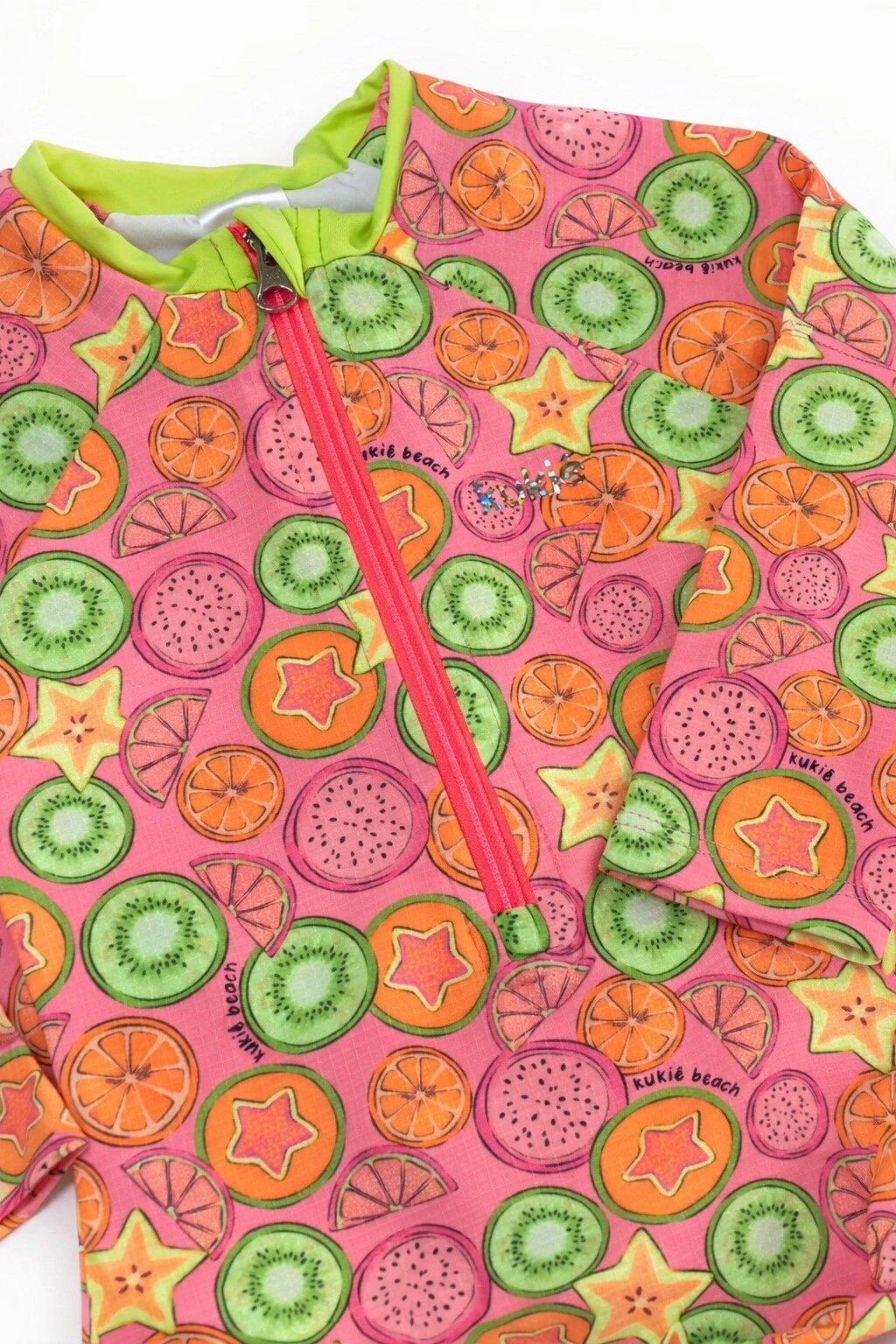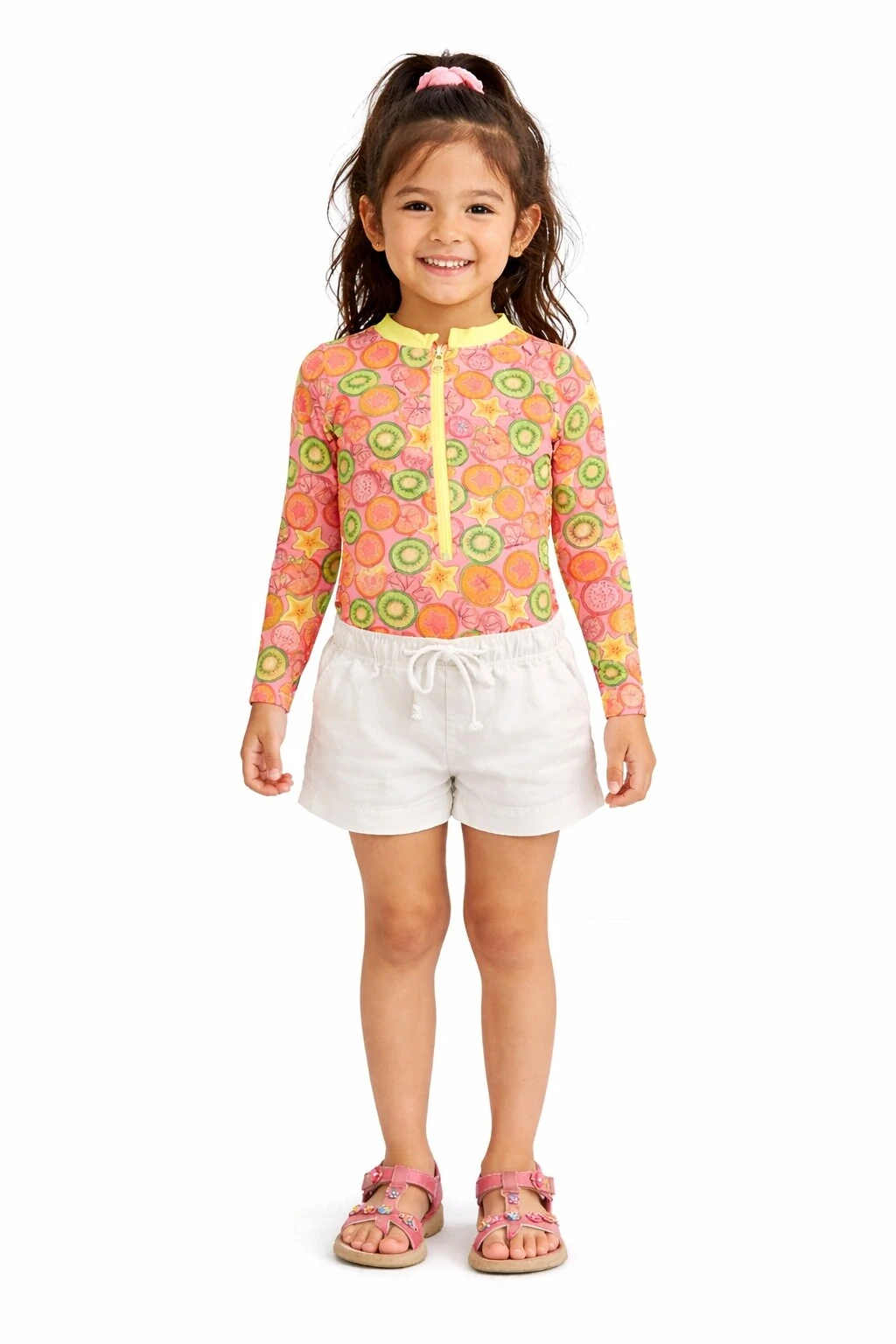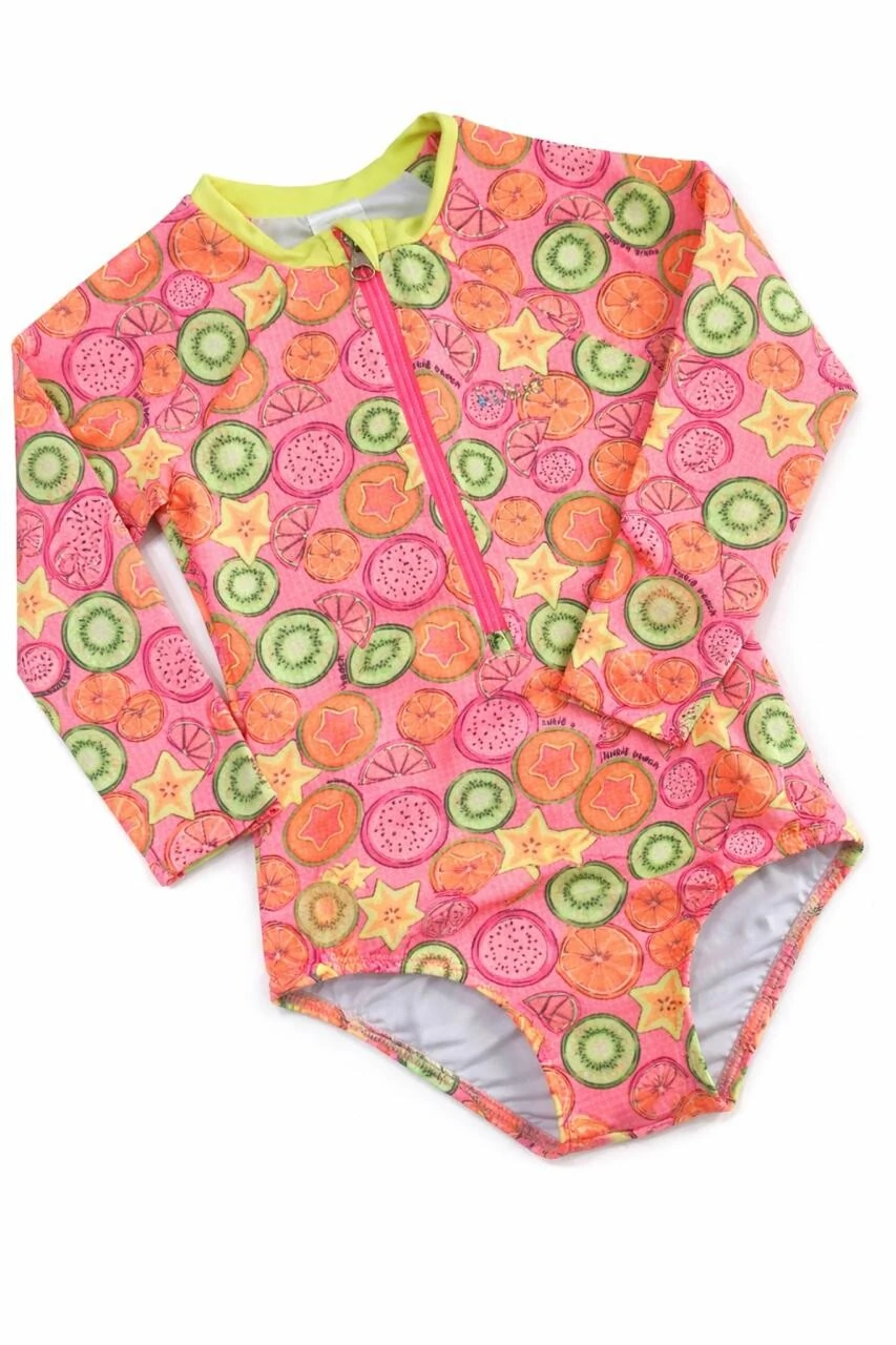 Maiô manga longa em malha texturizada com proteção UV+. Estampa de frutinhas. SHORT NÃO INCLUSO.