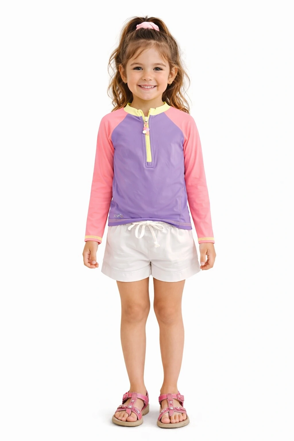 Conjunto de blusa e calcinha em malha com proteção UV+. Com cores Neon. SHORT NÃO INCLUSO.