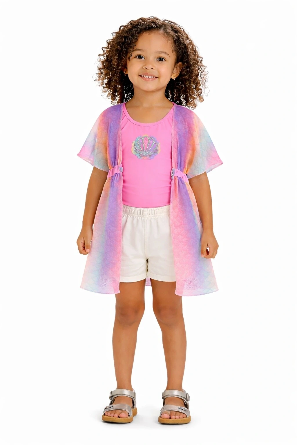 Conjunto de Maiô em malha com proteção UV+, e saída de praia em tule com estampa de sereia. SHORT NÃO INCLUSO