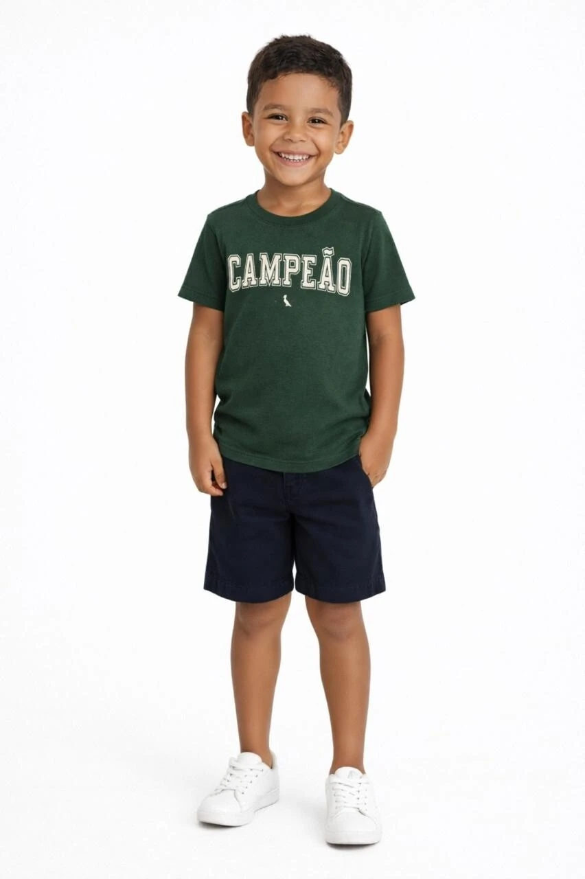Camiseta verde escura em malha 100% algodão. Estampa escrita CAMPEÃO em letras brancas no estilo envelhecido. BERMUDA NÃO INCLUSO.