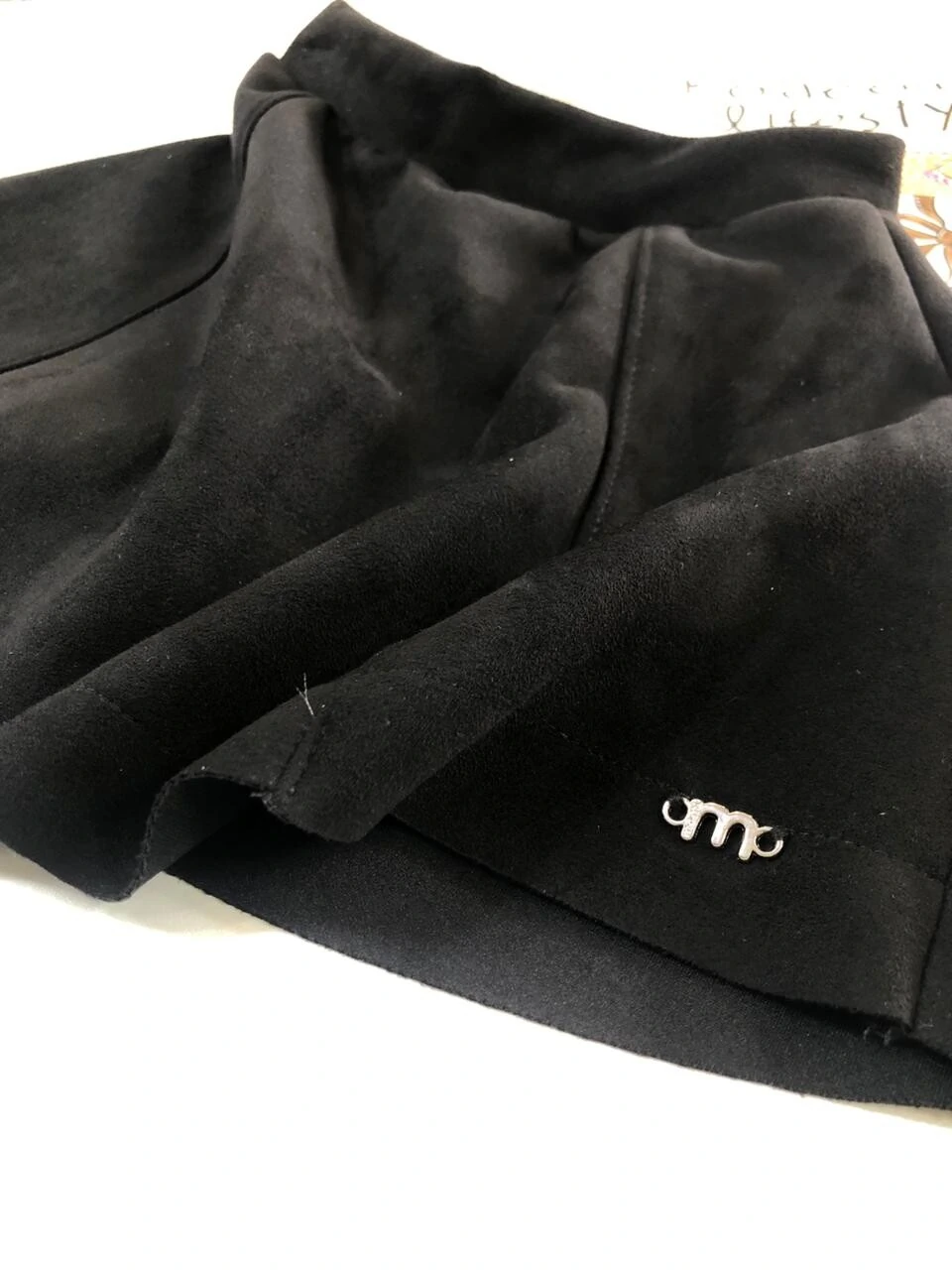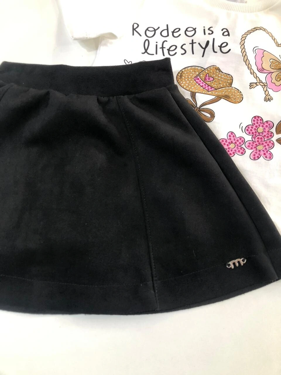Conjunto blusa em malha com estampa de rodeio, e saia em veludo com short de proteção.