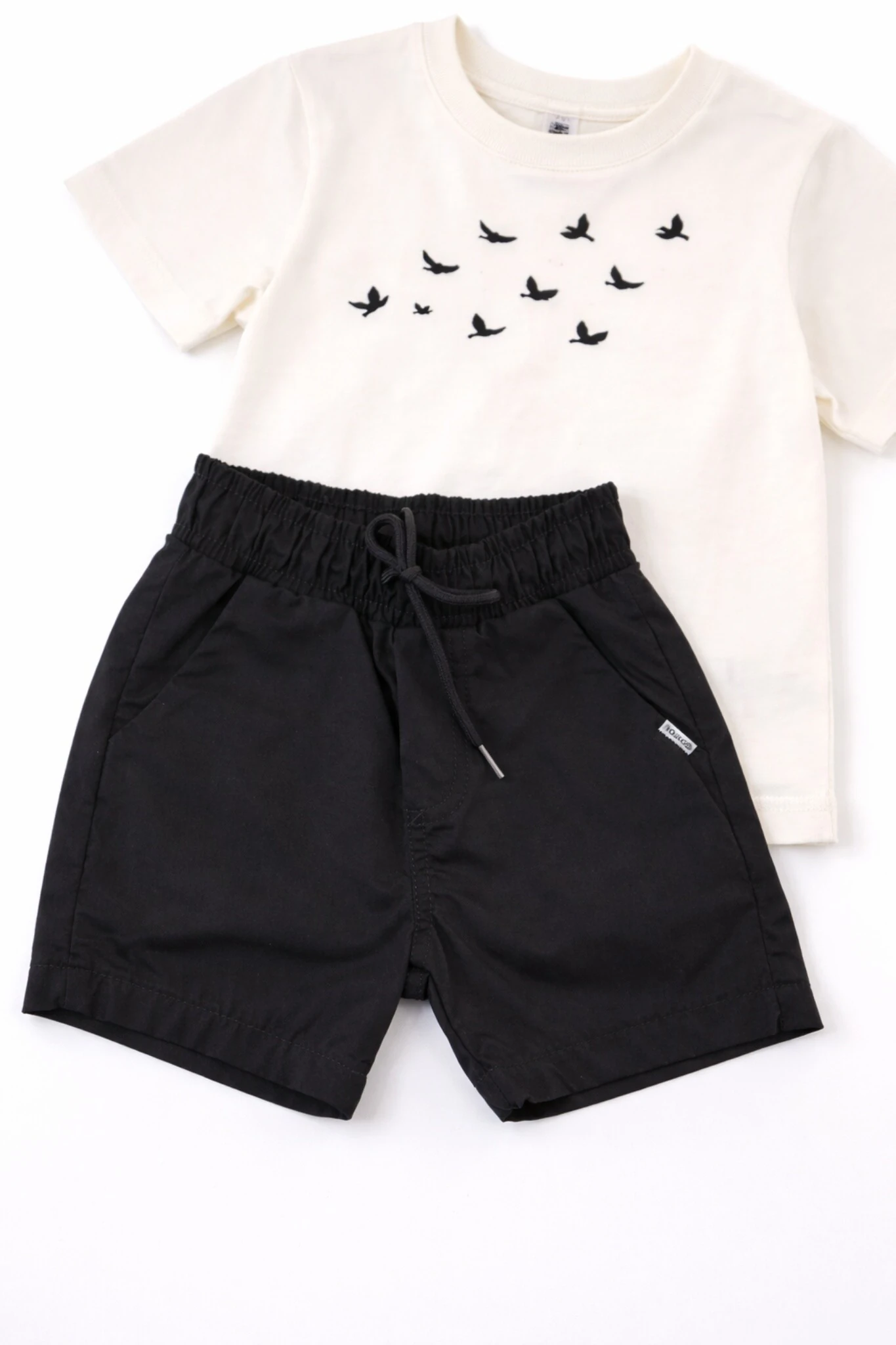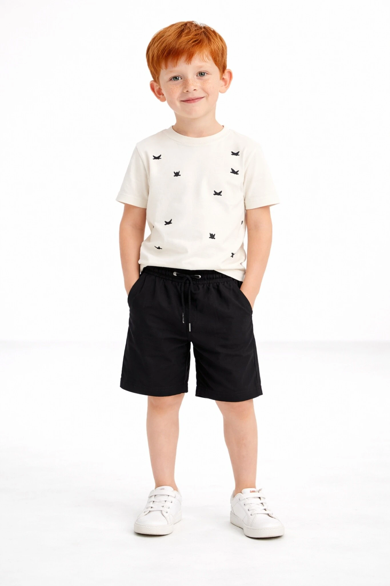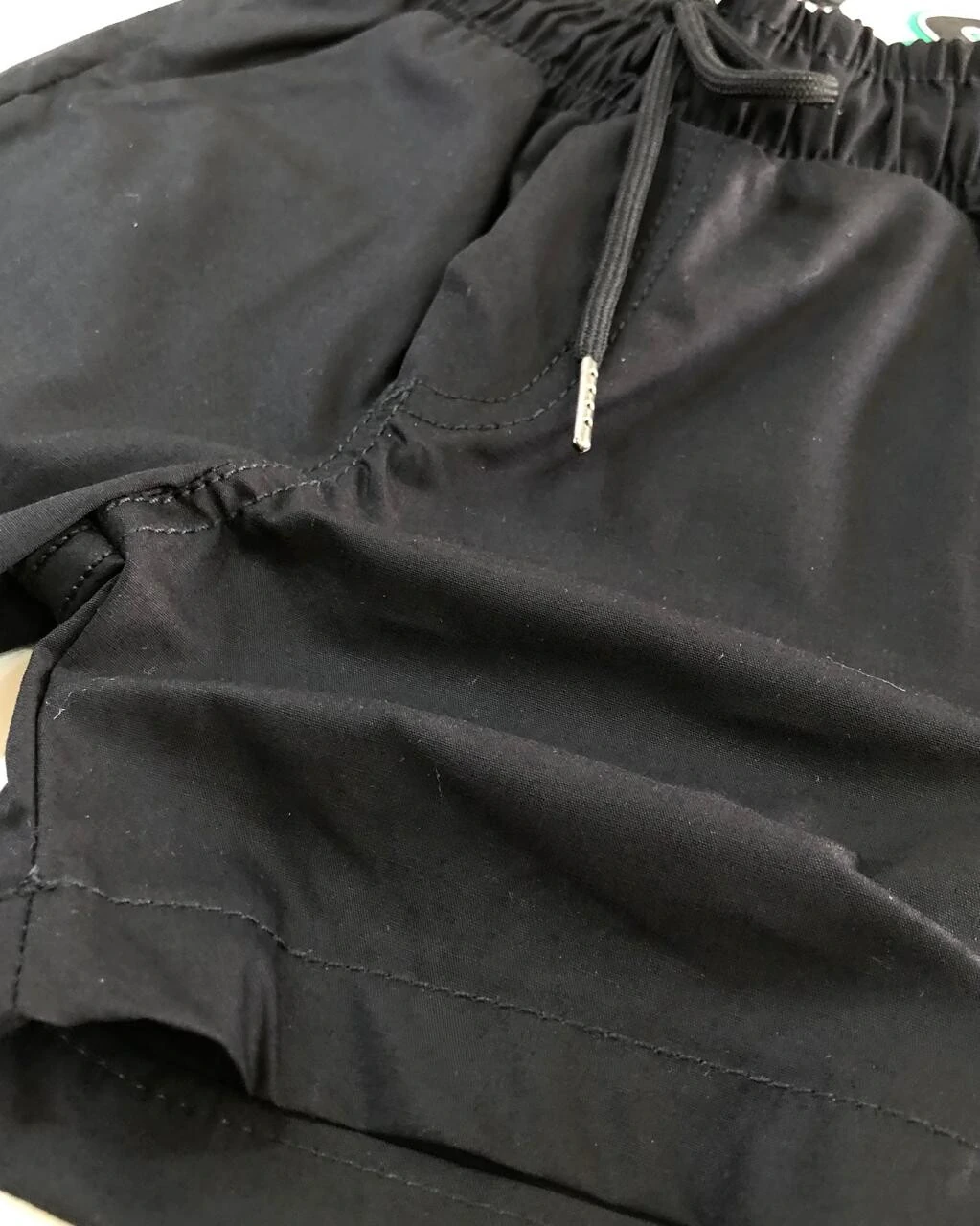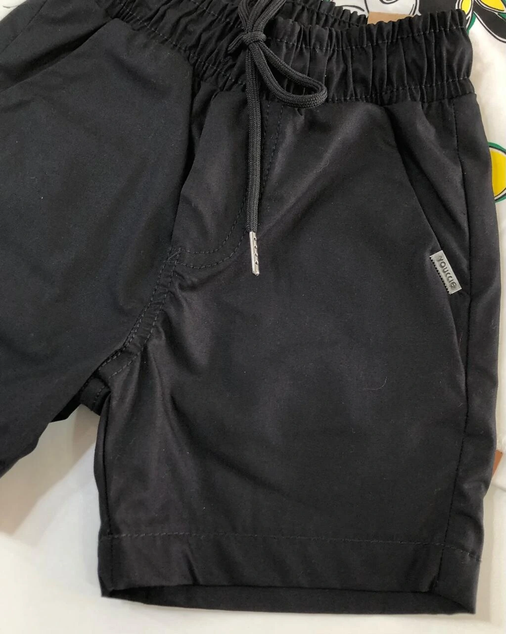 Bermuda preta em sarja da Youccie. O cós com elástico e ajuste por cordão, e acabamento com barra dobrada e bolsos frontais. CAMISETA NÃO INCLUSA.