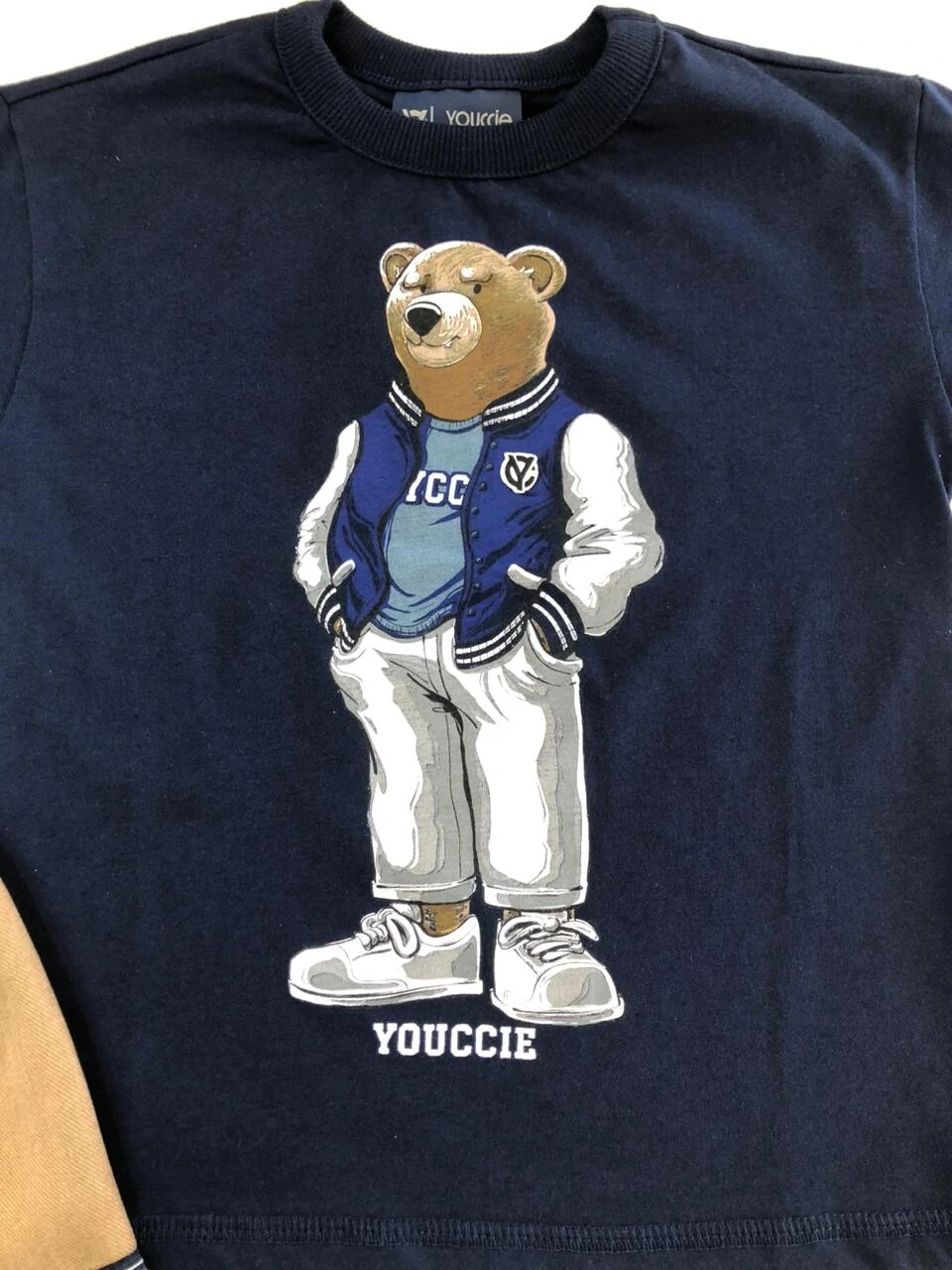 Conjunto Youccie de camiseta e bermuda, com estampa de ursinho. Camiseta no azul marinho e a bermuda na cor kacki e em tecido leve.