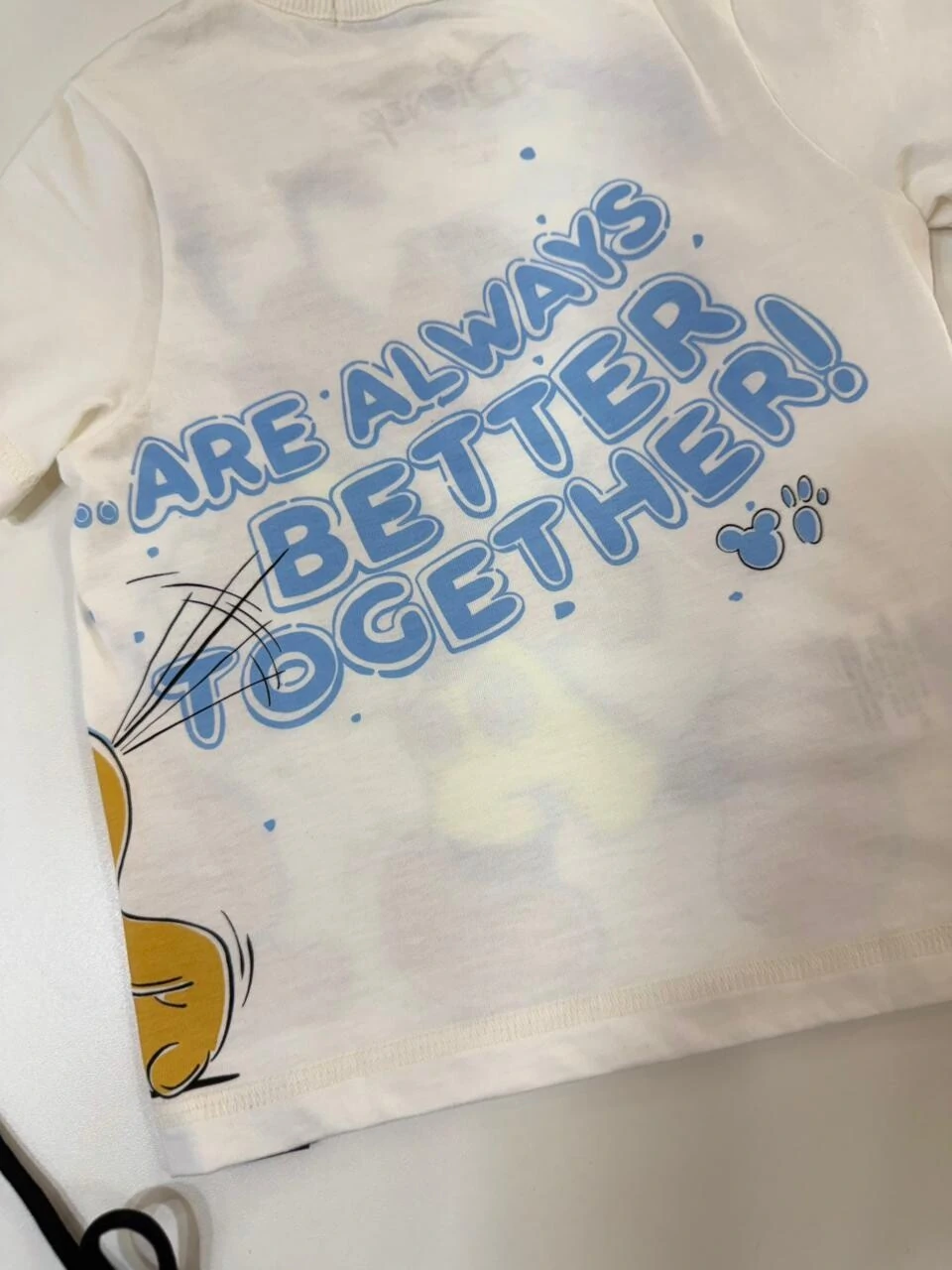 Camisa off white com estampa de Pluto e Mickey, e bermuda preta em tecido sarjado.