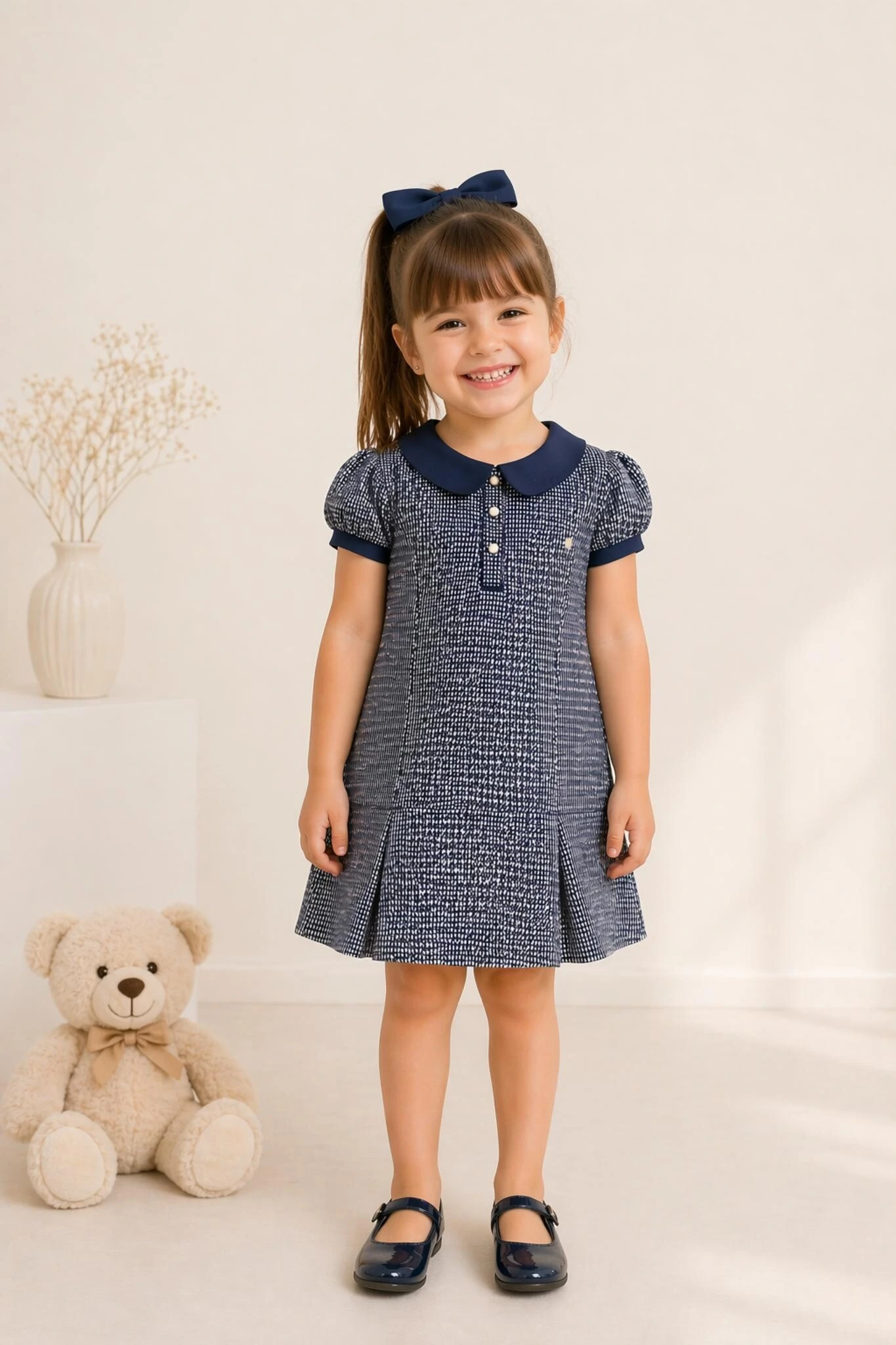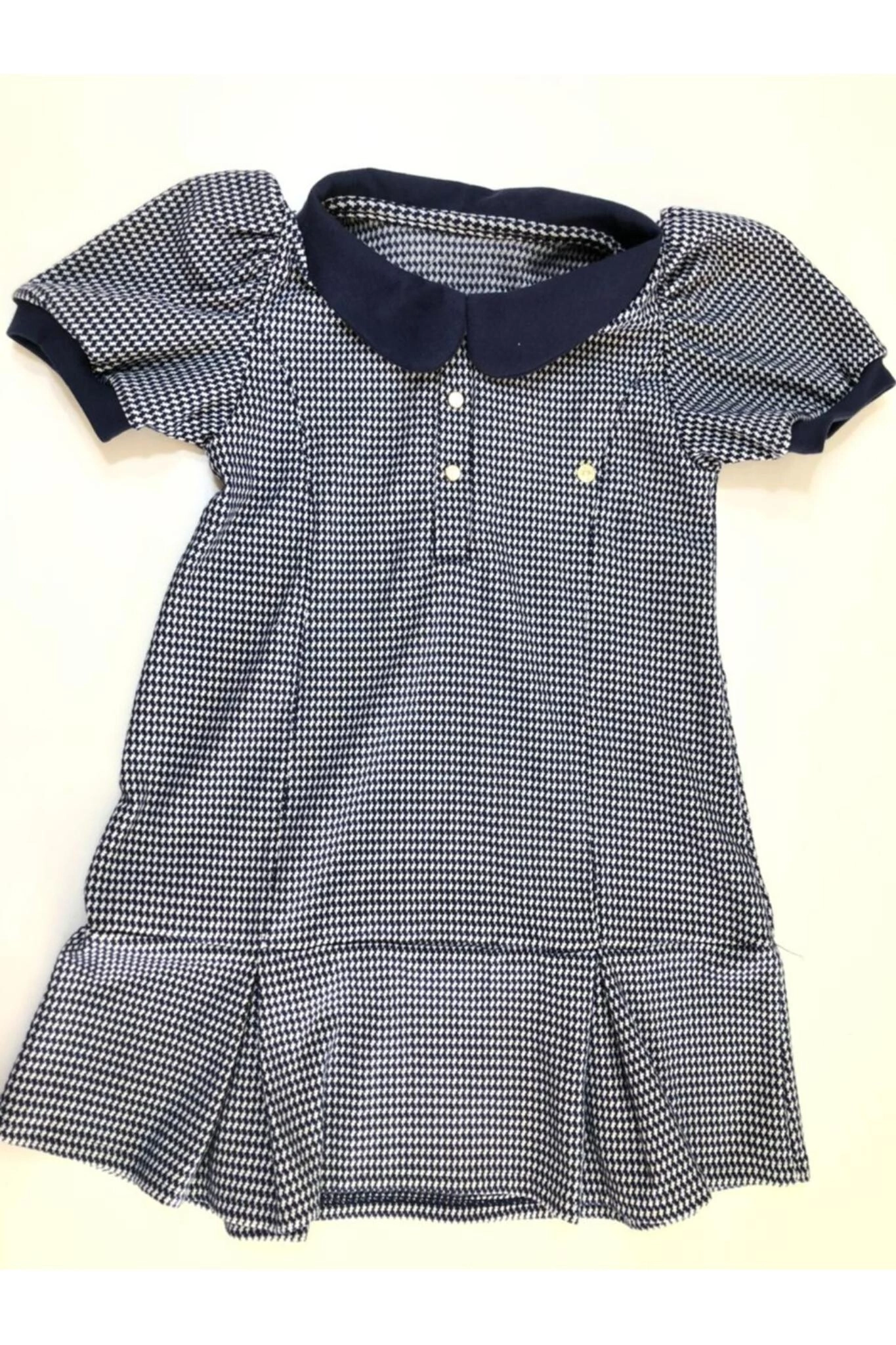 Vestido Polo manga curta em malha Jacquard. Gola Polo que remete ao estilo Preppy e à moda tradicional europeia. Botões para vestir com facilidade. Estampa Pied de Poule.